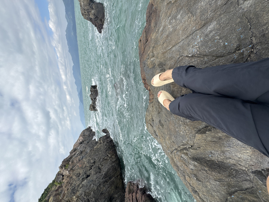 A person, wearing beige sandals and black pants, sits on a rocky cliff overlooking the sea