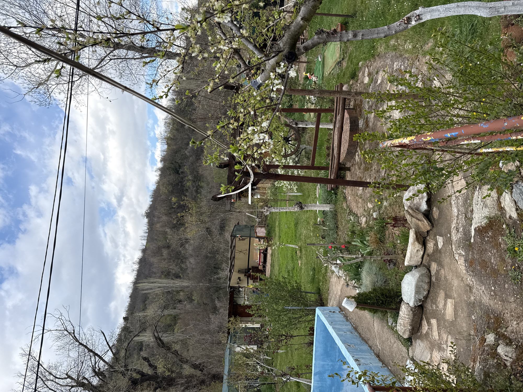 yard in Pokrovnik, Bulgaria. A brown wooden structure stands in the foreground, beneath a flowering tree. The path leading to the house consists of concrete slabs and stones. The house is beige with a slanted roof. In the background is a hillside covered with trees. Overhead are power lines stretching across a cloudy sky.