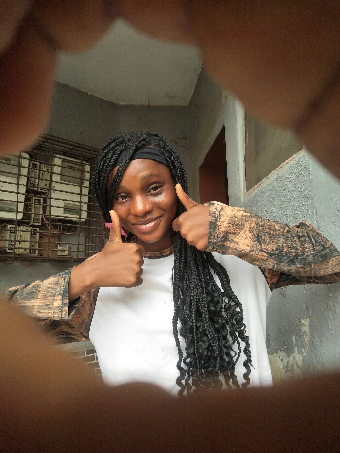 A female subject is captured in a medium close-up, centered, in an outdoor or semi-outdoor utility area in Iranla, Nigeria. The subject, a young adult with a dark complexion, smiles directly at the camera. She wears a white t-shirt layered under a long-sleeved garment with a distressed brown and black pattern. Her long black braided hair features curly ends and is secured by a black headband. Both hands are raised, displaying a "thumbs-up" gesture. The background on the left features a metal grate enclosing multiple electrical meters or utility boxes with visible wiring. To the right, a plain grey concrete wall is visible. An overhead concrete structure, possibly a ceiling or overhang, forms the top background. Portions of fingers or hands are partially visible at the top and bottom edges of the frame.