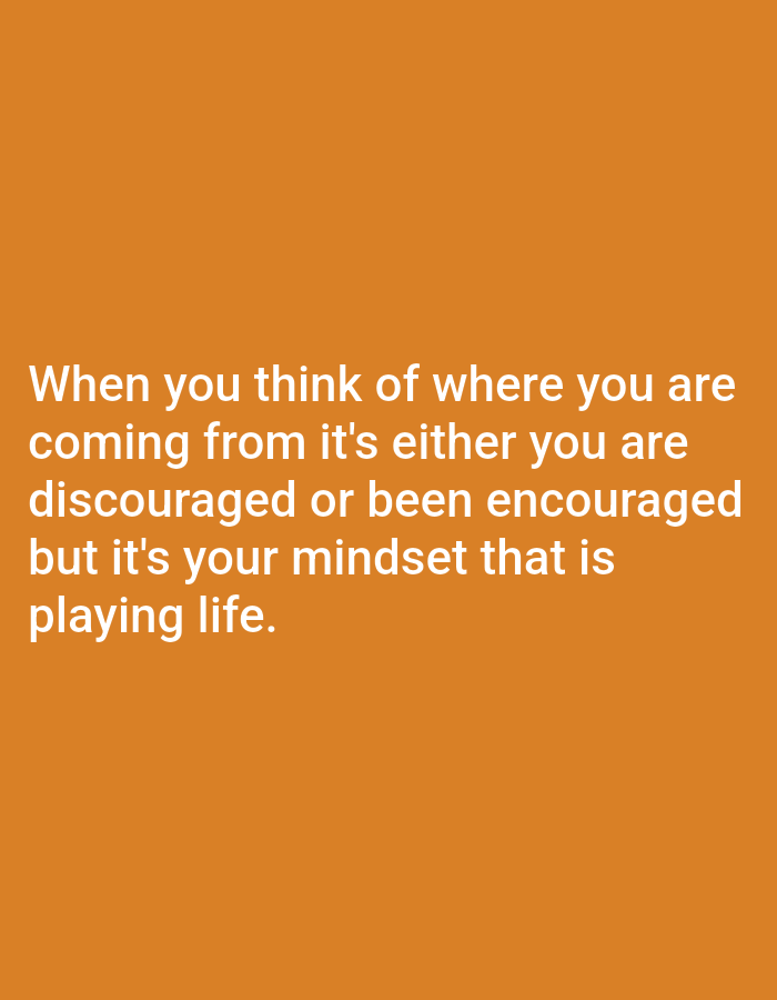 The image displays a digital graphic with white sans-serif text against a solid orange background. The text, centered on the screen, reads: "When you think of where you are coming from it's either you are discouraged or been encouraged but it's your mindset that is playing life." No individuals, physical objects, actions, or interactions are visible. The environment consists solely of the uniform orange digital color field. This image is associated with the city of Tumfure, Nigeria.