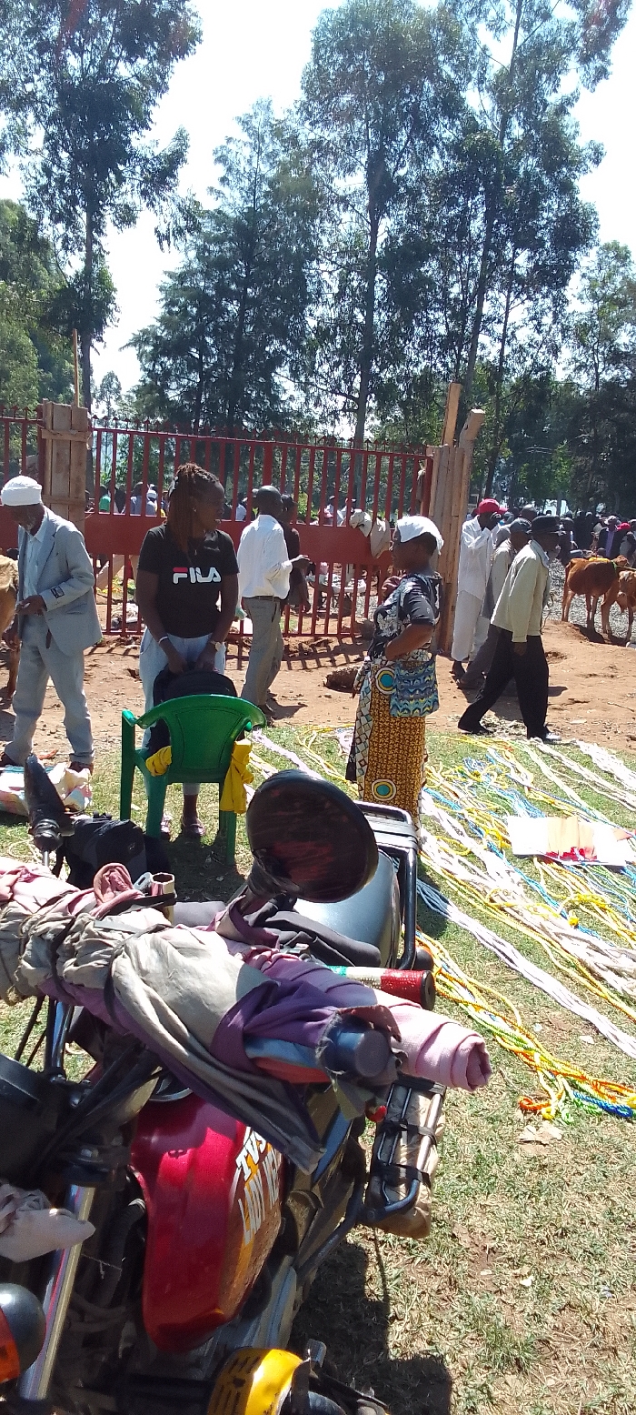 The image depicts a scene in Kakunga, Kenya (latitude: 0.374, longitude: 34.855) with several people, a motorcycle, and a variety of objects. A woman wearing a black shirt with the word "FILA" on it stands next to a green plastic chair. She is surrounded by a crowd of people, including a man in a white shirt standing nearby, and a woman in a colorful dress, a man in a white shirt and a man in a grey shirt and a woman in a black and white dress, all standing to the right. The woman in the black and white dress has a bag hanging from her waist. The motorcycle is parked on grass in front of a red gate, with many strings of colorful beads lying on the grass. The motorcycle is partially obscured by the green chair, with the handlebars and a portion of the red gas tank visible. The scene is likely a market or gathering, with people possibly buying and selling goods. The background features numerous people, including a few walking away from the camera, and a variety of trees. The scene is under clear skies with no signs of rain or clouds. The ground is primarily made up of dirt and grass.