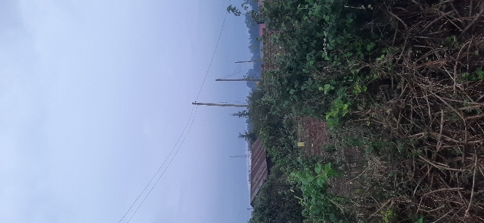 The image depicts a rural landscape under a cloudy sky. Three utility poles with power lines stretch across the scene. Dense vegetation, including various shrubs and small trees, dominates the foreground and midground. A corrugated metal roof peeks through the greenery. The overall scene suggests a remote or undeveloped area.