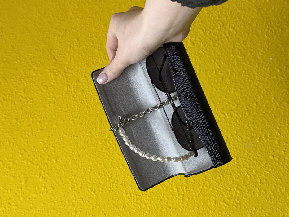 - "A human hand, exhibiting light pink polished fingernails, holds an open black textured glasses case against a vibrant, textured yellow wall in the city of Unknown, Unknown" by FM-384gD3, licensed under CC BY 4.0