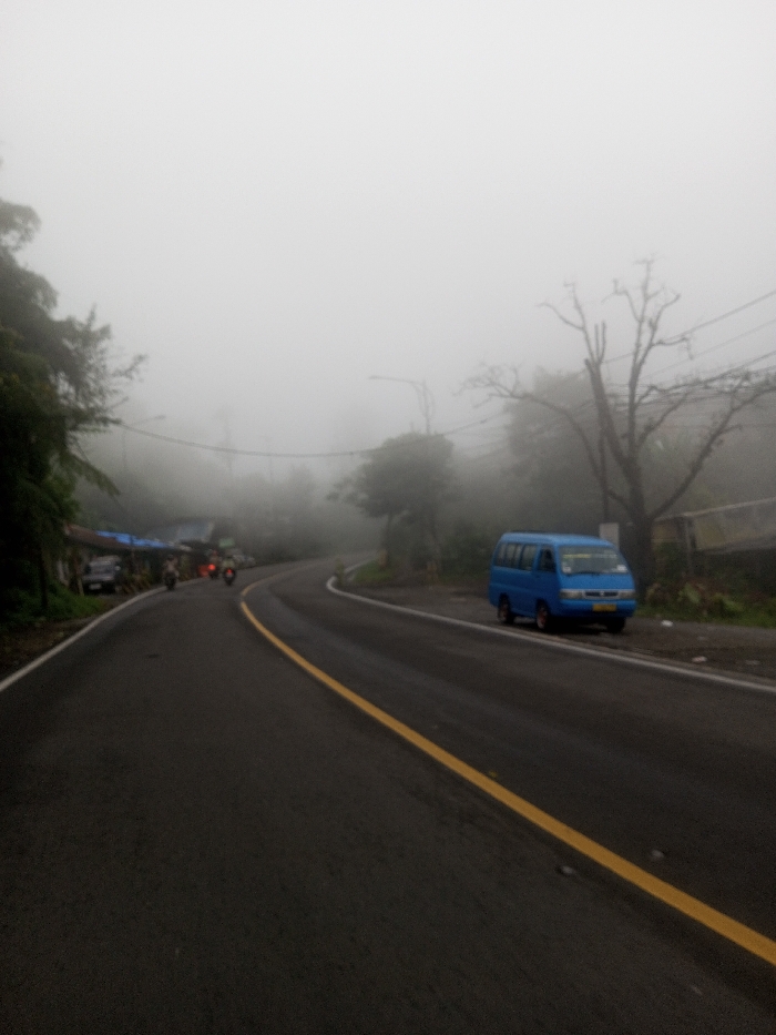 A winding road with a yellow dividing line curves through heavy fog. Trees and vegetation line the left side, while a blue van is parked on the right shoulder. Streetlights are visible through the fog. Motorbikes can be seen further down the road, partially obscured by the mist. Visibility is significantly reduced by the pervasive fog.