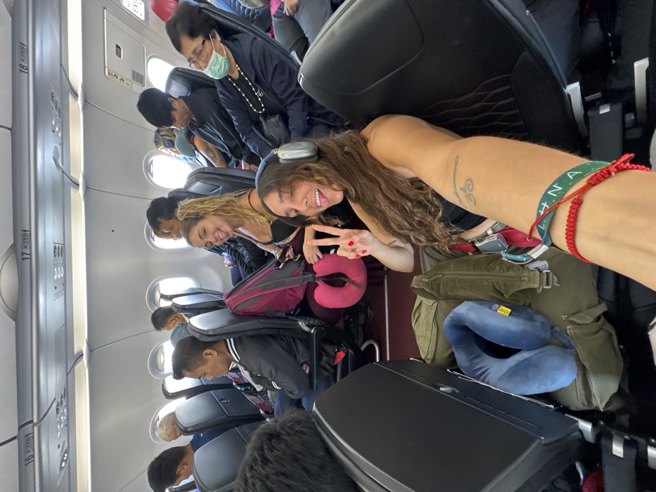 Inside an airplane, a woman with headphones poses with a peace sign. Next to her, another woman smiles. Passengers fill the seats, some wearing masks. Overhead compartments line the walls. Luggage and neck pillows are visible on the seats and floors.