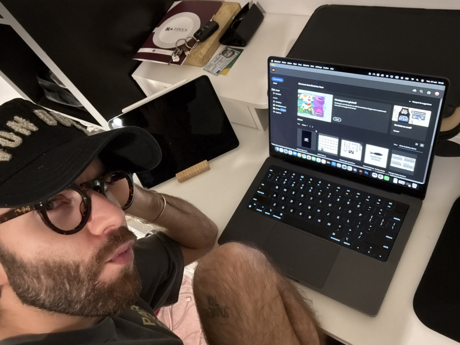 The image, taken in Chambœuf, France, shows a male individual seated at a white desk, visible from the chest to the upper right thigh. He has a beard and mustache, wears dark-rimmed glasses, and a black baseball cap with light-colored text. A gold-colored bangle is present on his right wrist. His right arm rests on the desk. A tattoo is visible on his right upper thigh. On the desk, an open dark-colored laptop with a backlit keyboard is positioned. To its right, a tablet functions as a secondary, vertically oriented display, showing an interface with various images and text. A small cork object lies between the man's arm and this tablet. Further to the right, a dark-screened tablet rests on a white stand, accompanied by a white stylus (Apple Pencil). Behind these items are a dark-covered book, a set of keys with a black car key fob, several identification or credit cards (one with a green stripe), and a pair of dark sunglasses. The background is dark and appears to be an interior space.
