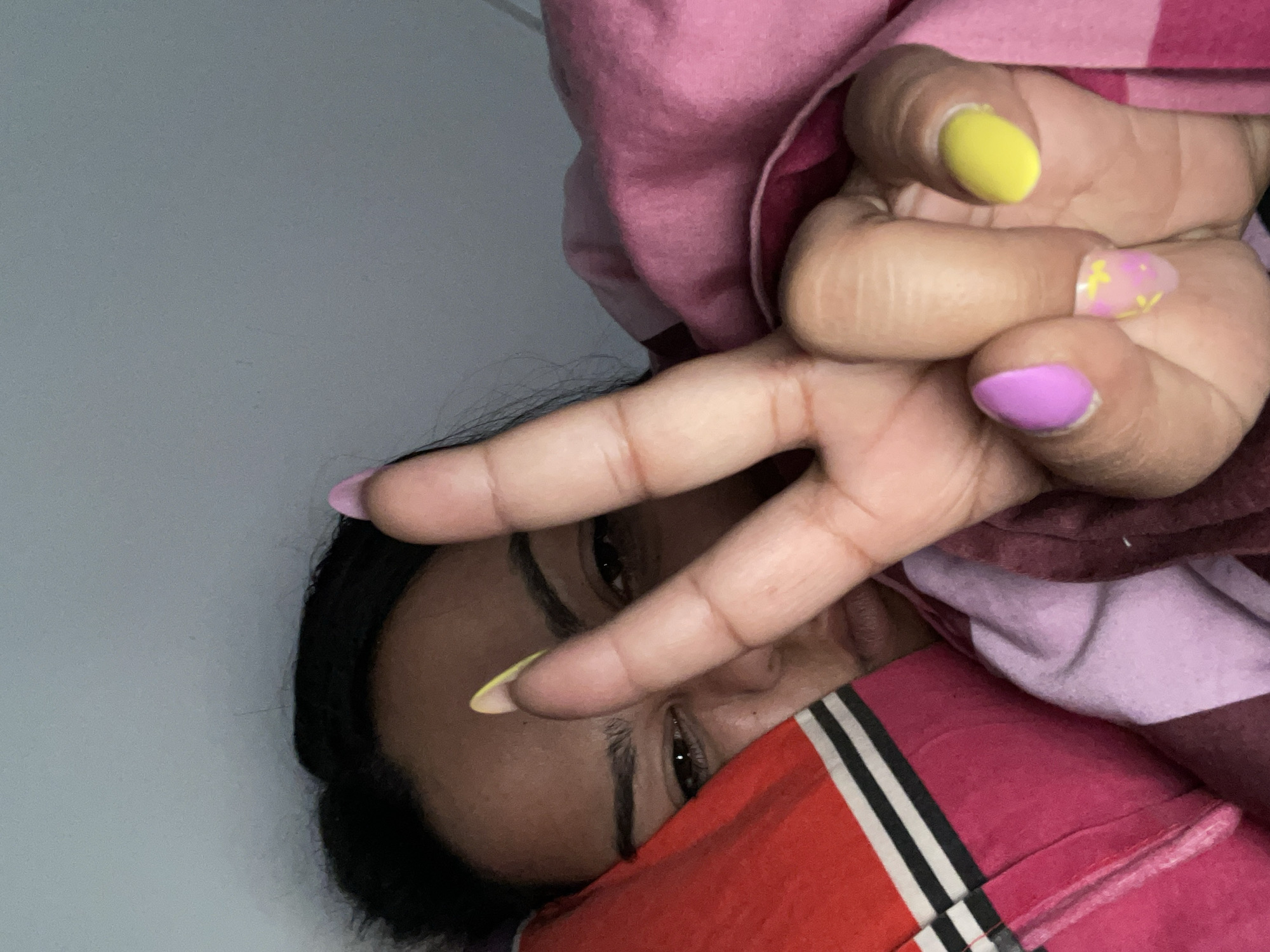 A woman is partially visible, with dark hair and eyes, making a peace sign with her hand in front of her face. Her fingernails are painted in various colors, including yellow and lavender. She is wearing a pink and red garment. The background includes a light gray wall. The location is not identifiable in the image. The city of Dronten, Netherlands is not identifiable.