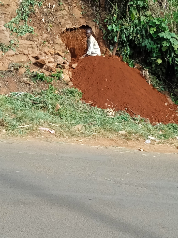 The scene, located in Embu, Kenya, displays an adult male engaged in excavation activity on a roadside embankment