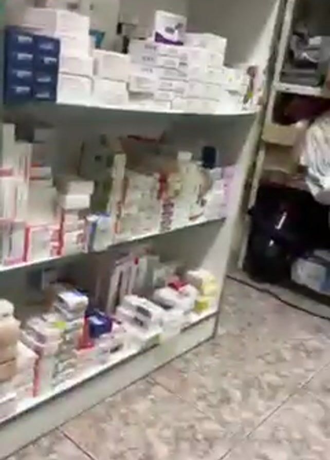 blurry and unsteady view of what appears to be a storage room or supply closet. There are shelves filled with various items, mostly in white packaging, with some blue and yellow accents. The floor is a light-colored tiled surface. The camera movement is erratic, making it difficult to discern specific details.