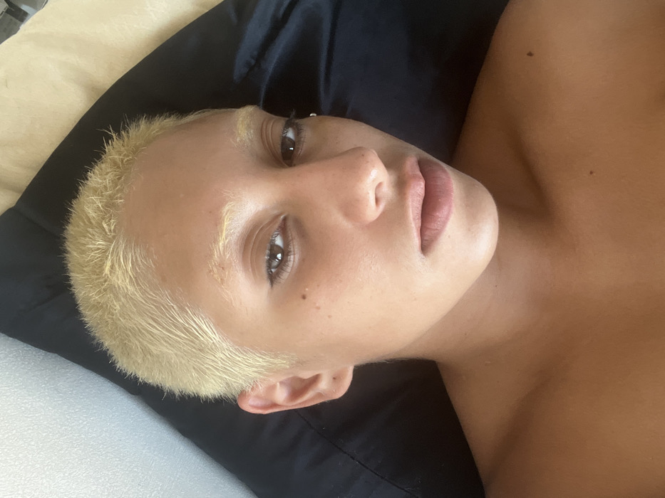 The image displays a close-up portrait of an individual with a warm, tan skin tone. The subject has short, spiky bleached blonde hair and bleached blonde eyebrows. Brown eyes are visible, accented with thin dark eyeliner. A small silver stud piercing is present in the left earlobe. Several small, dark epidermal nevi are visible on the face (e.g., right cheek) and upper chest. The individual's shoulders and upper chest are bare. The head is positioned against a dark, likely black, pillow or fabric, with a lighter, possibly cream-colored fabric in the upper right background and a textured light-colored wall section in the upper left background. The subject maintains a direct, neutral gaze towards the camera. The scene is an indoor setting. No specific location within Buenos Aires, Argentina, can be determined from the provided visual information.