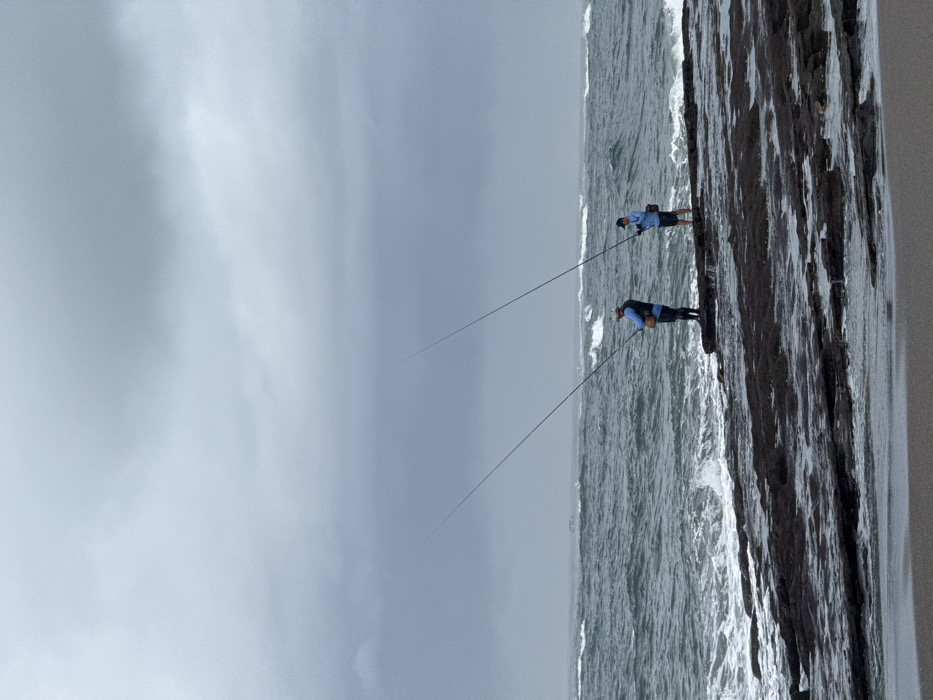 Two fishermen stand on a rocky outcrop beside the ocean, each casting a fishing line. The sky is overcast, adding to the somber mood. Waves crash against the rocks, highlighting the boundary between land and sea. The men wear blue shirts, contrasting against the dark rocks and tumultuous water. The scene captures a moment of quiet concentration amidst the power of nature.