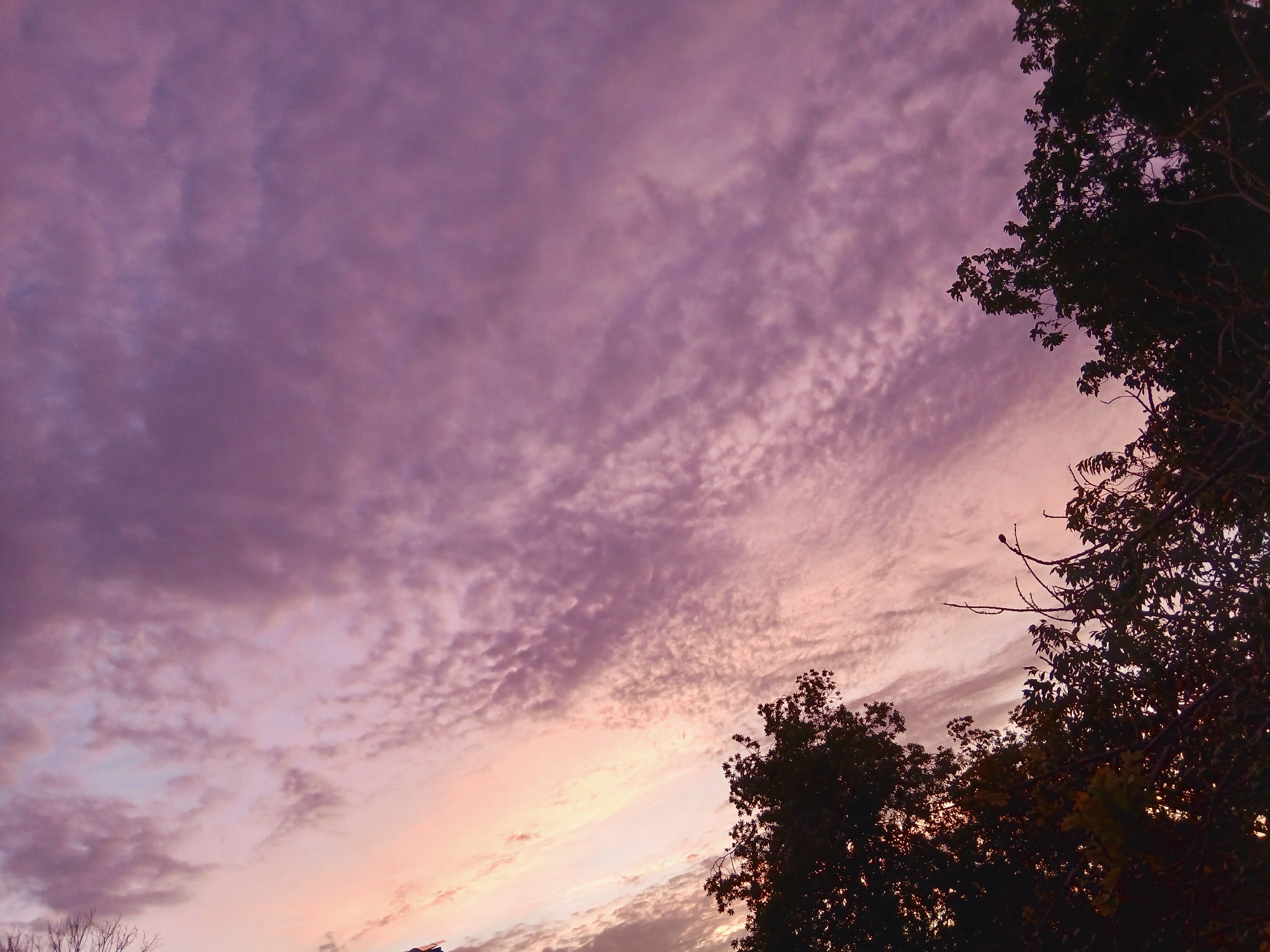 A low-angle shot captures a sky filled with pink and purple cirrocumulus clouds, fringed by the silhouette of tree branches