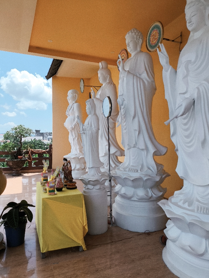 The scene captures a semi-outdoor terrace or balcony in the city of Diên Khánh, Vietnam. Five white, full-body statues of Buddhist figures are arranged linearly against a bright orange-yellow wall, which extends into the background. These statues, varying in size, stand on sculpted lotus bases and are depicted in flowing robes. Circular decorative plaques, featuring a red swastika (manji) on a green and gold background, are mounted on the wall behind some of the figures. In the foreground, a small rectangular table draped with a yellow cloth serves as an altar. It holds various items including several colorful, layered candles or decorative objects, small religious figurines, and other ritualistic offerings. To the left of the altar, a dark green potted plant sits on the light brown, tiled floor. A slender stand supporting a circular mirror is positioned between two of the statues. The left side of the image opens to an exterior view under a bright blue sky with scattered white clouds. A dark railing, behind which a potted bonsai tree is visible, separates the terrace from the distant urban landscape of buildings and green foliage. A dark, sloped roofline is partially visible in the upper left corner. Electrical cords are visible on the floor near the bases of the statues. No individuals are present in the frame.