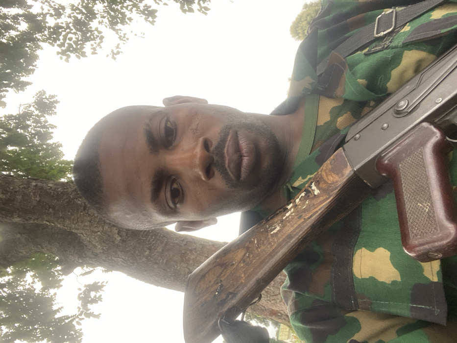 An adult male is depicted in a close-up, selfie-style photograph, positioned outdoors. He has short dark hair, a trimmed beard, and visible scars on his left cheek and forehead. He wears a green camouflage pattern uniform shirt over a plain green undershirt. An AK-style rifle, featuring a worn wooden stock and a dark handguard, is held or slung across his body, diagonally across the frame. A dark strap is visible over his right shoulder. The background features a tree trunk with textured bark behind his left side and light-colored foliage against a bright sky, indicating a natural outdoor setting. The specific location within Zaki Biam, Nigeria, cannot be determined from the visual evidence.