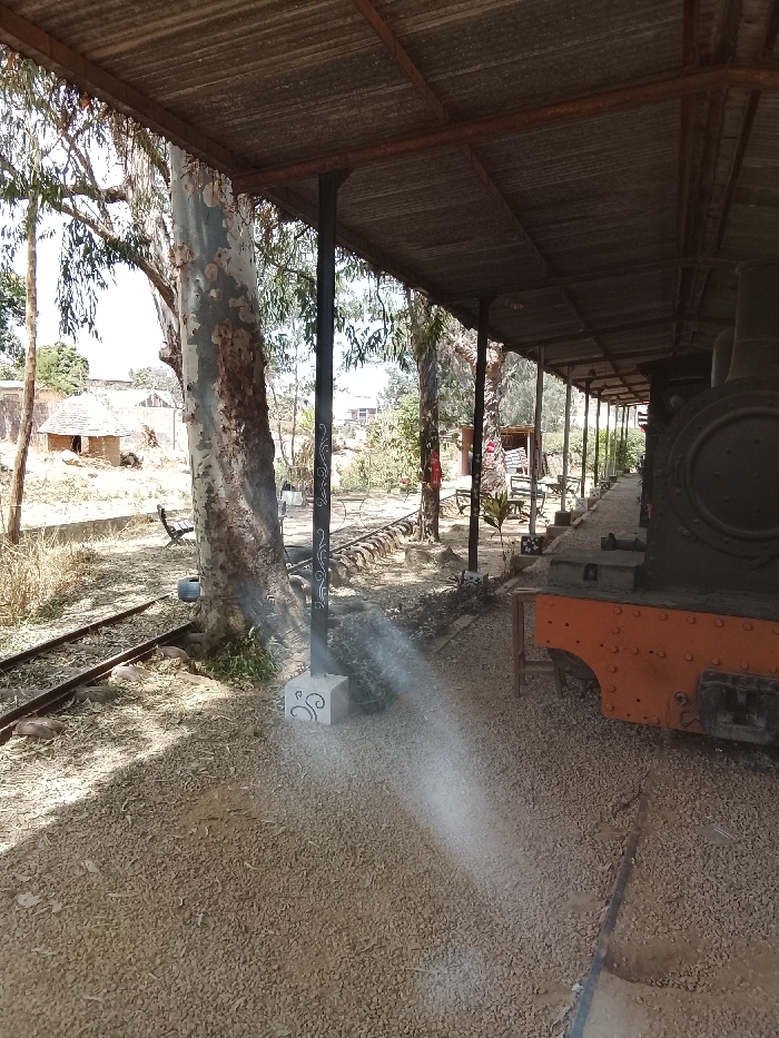 The image displays an outdoor scene identified as the Jos Railway Museum or Terminus in Jos, Nigeria
