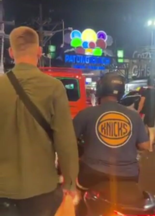 At night, a street scene in Patong Beach, Thailand is bustling with pedestrian and vehicular traffic. A fair-skinned man with short blond hair, wearing a dark green, long-sleeved shirt and black shorts, is walking away from the camera with a dark messenger bag over his left shoulder. He’s carrying a white plastic bag in his right hand. Slightly to his right, a person on a motorcycle with a black helmet and a navy blue T-shirt with a New York Knicks logo is also traveling in the same direction. The motorcycle has a license plate with "100 21" on it. Behind them, a line of cars and motorcycles is visible, and many other people are walking around. In the background, the brightly lit “PATONG BEACH” sign with colorful balloons above the letters is visible. The scene is filled with artificial light from streetlights and the various businesses. There is also a sign that says "Crazy Girls Gifts" visible.