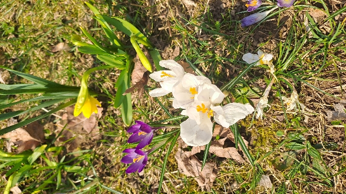 The image presents a detailed, ground-level view of an outdoor natural environment in Pilsen, Czechia, under natural sunlight. The primary subjects are flowering plants. In the center-left foreground, a cluster of three white crocuses is fully open, displaying prominent yellow-orange pistils and anthers. To their immediate upper-left, two purple crocuses are also visible, partially open with similar yellow centers. In the upper-right quadrant, a single yellow daffodil bud is present, mostly closed on a curved green stem. The ground is a mixture of emergent green grass, areas of exposed brown soil, and several dry, crumpled brown deciduous leaves scattered throughout, particularly in the mid-left. Various long, green, strap-like leaves characteristic of bulbous plants are intermingled with the grass and flowers. A small patch of vibrant green moss is visible in the lower-center-left. No individuals, animals, or artificial structures are depicted in the frame.