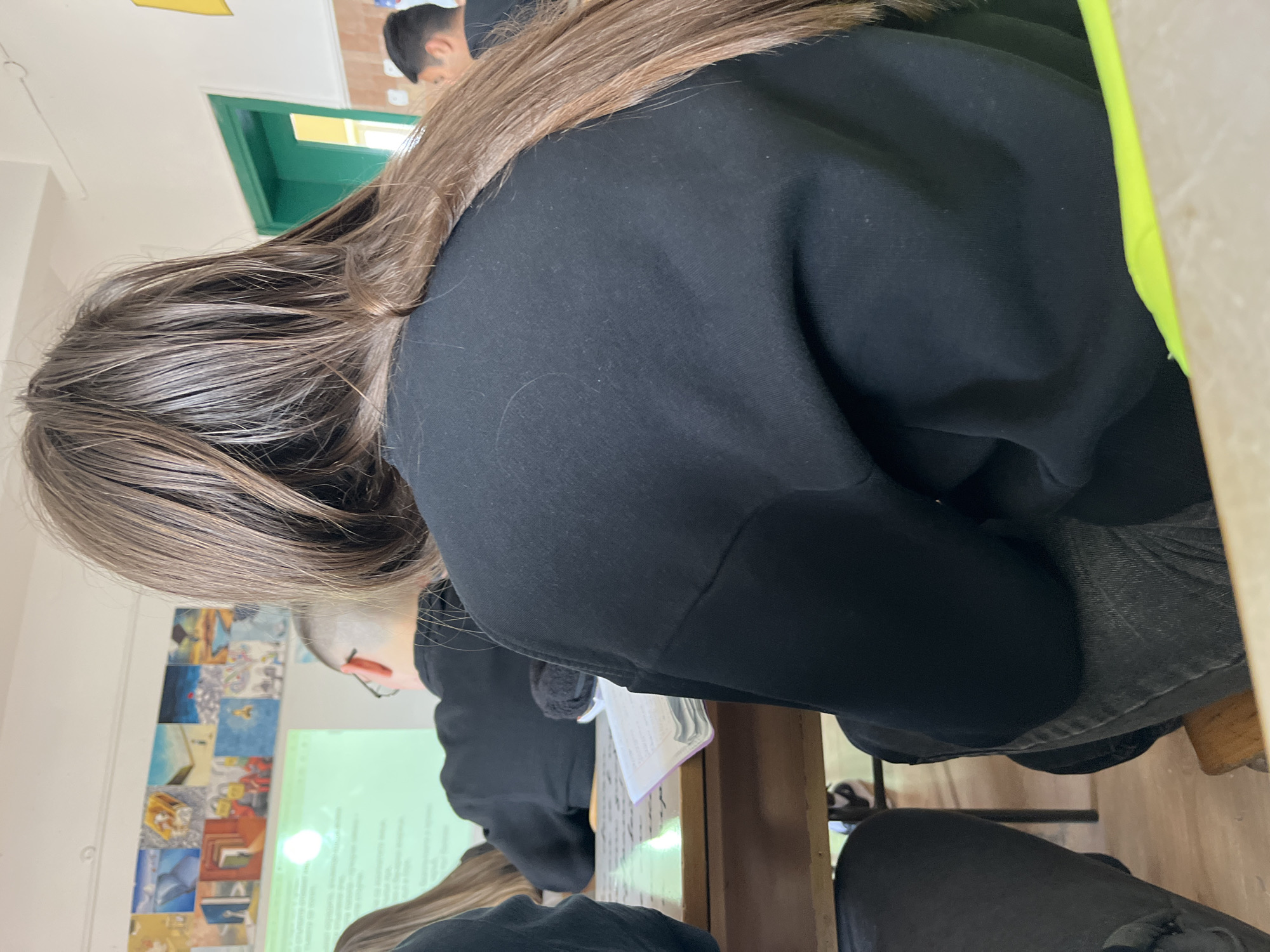 The image captures a classroom in Panagyurishte, Bulgaria, viewed from behind a seated student. The primary subject, in the immediate foreground, is a person with long, medium-brown hair, wearing a black long-sleeved top and dark pants. This individual is seated at a light-colored wooden desk, upon which an open book or notebook with visible text is resting. In the mid-ground, directly in front of the primary subject, another student is visible from behind. This male student has short, light-brown hair, wears glasses, and is dressed in a black top. To the left, a partial view of another student with long, lighter brown hair and a dark top is present. Further to the right in the background, a fourth student with dark hair is partially visible from the side. The classroom environment includes white walls. A projector screen on the front wall displays illuminated text, likely in Cyrillic, above which a horizontal row of multiple small, framed art pieces or pictures is mounted. A distinctive bright green door frame is visible on the right side of the room, with a hint of yellow or light-colored wall beyond. The floor beneath the desks is a light-toned wood.