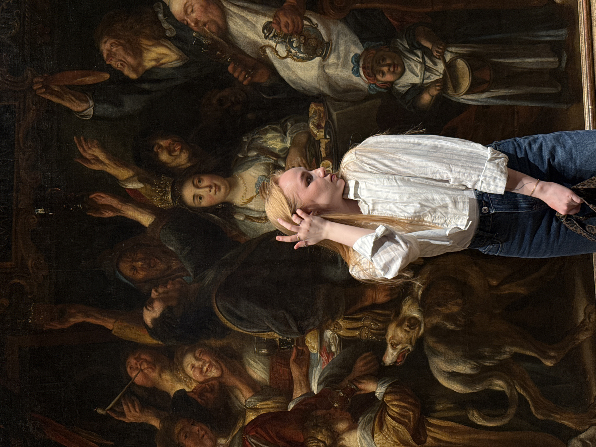 A young, fair-skinned woman with long blonde hair is positioned in front of a large painting. She is wearing a white, collared shirt and blue jeans. Her right hand is raised near her face. The painting behind her depicts a crowd of figures, many of whom appear to be making exaggerated expressions and gestures. There is also a dog visible in the painting. The woman and the painting are located in the Perm State Art Gallery in Perm, Russia.