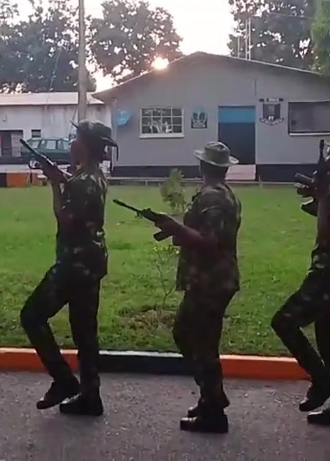 A static, eye-level shot captures a line of seven individuals marching in formation, dressed in camouflage uniforms and headwear