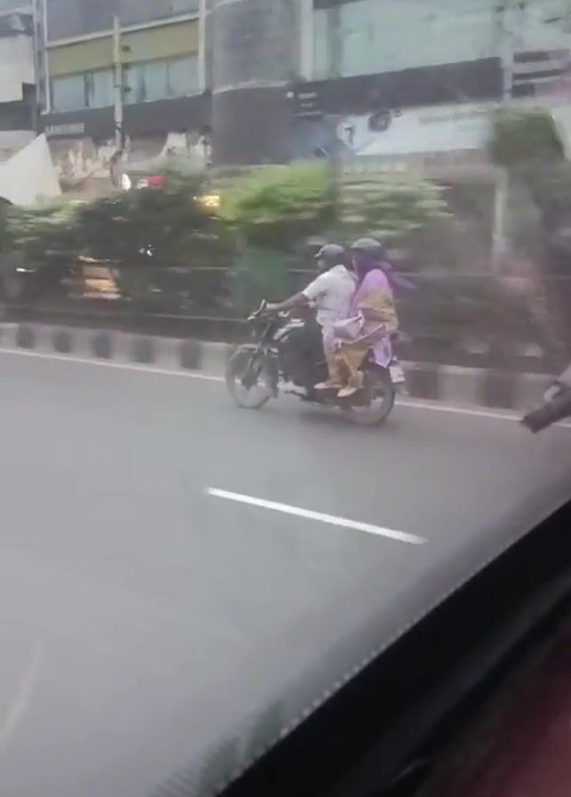 A vehicle occupant records through a slightly dirty windshield a view of a street in a city in Bangladesh. The road is wet. Buildings line the left side of the street. A pedestrian overpass is in the background. A motorcycle with a man and woman wearing helmets is in the lane to the left of the camera. The man is wearing a white shirt, and the woman is wearing a bright purple and yellow salwar kameez. A green CNG three-wheeled taxicab passes the camera on the left, and another motorcycle is in the lane to the right of the camera.