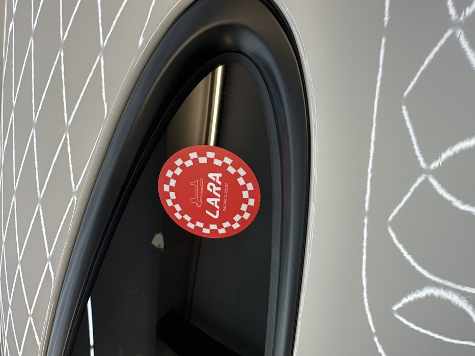 The image displays a close-up, angled view of a light-colored vehicle's rear quarter panel and adjacent dark-tinted window, consistent with the location of Pancharevo, Bulgaria. A circular red sticker with a white and red checkerboard border is affixed to the exterior of the window. The sticker features the word "LARA" in large white capital letters, with "RACING CIRCUIT" in smaller white capital letters beneath it. Above the text, a white outline graphic depicts a racetrack layout. The vehicle's paintwork exhibits numerous distinct, grid-patterned reflections, suggesting an indoor environment with structured overhead lighting. No individuals or active interactions are visible in the frame. The window is framed by a black rubber or plastic seal.