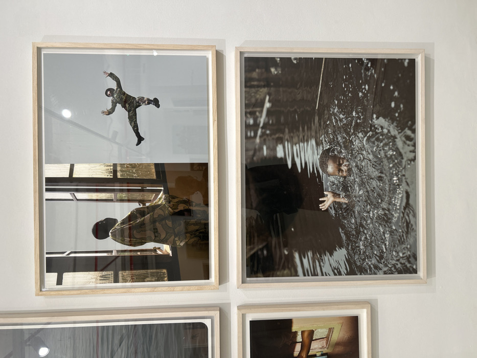 The image displays an art exhibition in a gallery located in Barcelona, Spain. On a plain white wall, three framed photographs are prominently visible, accompanied by two partially visible framed photographs on the left edge. The large upper-right horizontal frame contains two distinct images. The left image depicts an individual with dark skin, viewed from behind in profile, wearing a patterned garment and standing before an open window with wooden frames and textured glass, looking outwards. The right image shows a person in a camouflage military uniform, wearing boots and a helmet, suspended mid-air against a light gray background with arms and legs outstretched. Directly below this, a large horizontal photograph features a young child, appearing to have dark skin, partially submerged in dark, turbulent water. The child's head is visible with eyes closed or squinting, and the right hand is raised above the water's surface with fingers slightly splayed. The water exhibits ripples and small bubbles. To the left of the child's photograph, a partially visible vertical framed photograph shows an interior scene with an opening and shelves containing items. Above this, the lower portion of another vertical framed photograph is visible, depicting a blurred background with horizontal elements. All visible photographs are enclosed in light-colored wooden frames behind glass, reflecting ambient light from the exhibition space.