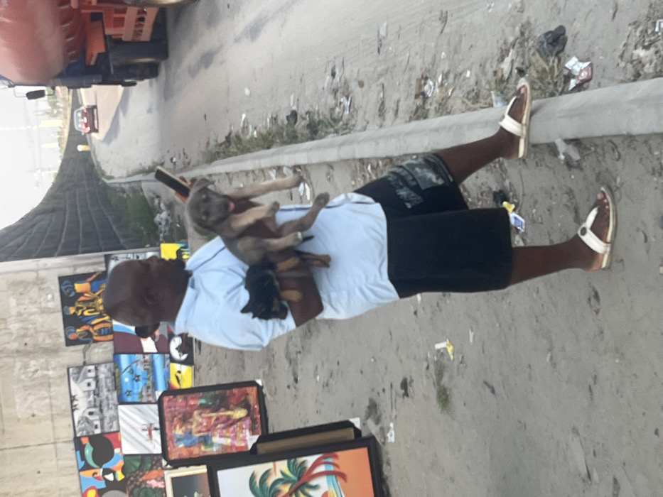 An adult male stands outdoors in Ikota, Nigeria, positioned on a dirt shoulder beside a paved road. He has dark skin, a partially bald head with dark hair tied back, and is wearing a light blue, short-sleeved collared shirt and dark shorts with a patterned section on the right leg. White sandals with light accents are on his feet; his left foot is on the dirt, while his right foot rests on a concrete curb. He holds two puppies in his left arm: a larger fawn-colored puppy faces forward with its mouth slightly open, and a smaller dark brown/black puppy is held horizontally, facing left. In his right hand, he holds a black smartphone vertically. Behind him, to the left, a collection of framed paintings in various styles (abstract, landscape, figurative) are displayed on the ground and leaning against a rough concrete wall. To his right, a gray asphalt road shows an orange tanker truck moving away from the camera, and a red car further in the distance. The dirt shoulder next to the curb contains scattered debris and litter. A dark mesh-like fence or barrier runs along the top of the concrete wall beside the road.