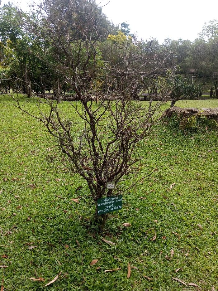 - "A Callistemon bush, mostly barren with sparse, dried foliage, stands in a grassy field" by FM-aMjHv1, licensed under CC BY 4.0