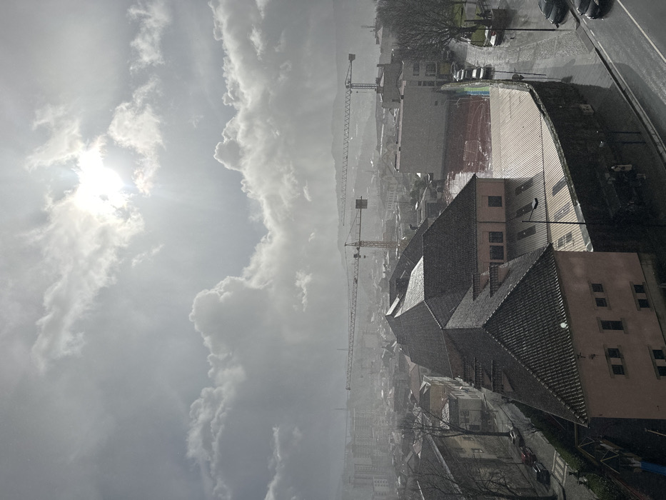 A high-angle shot of a cityscape under heavy rain. The sky is filled with gray clouds and a bright sun trying to break through. Construction cranes stand tall amidst buildings with dark roofs. A wet road with parked cars runs along one side of the frame. The rain obscures the details of the city below.