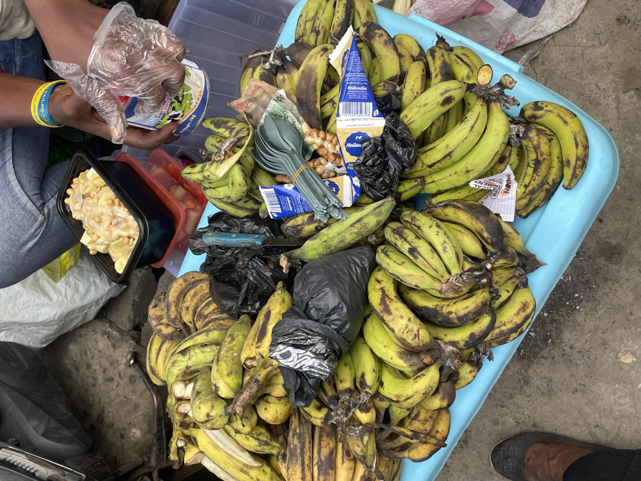 The image captures an overhead view of a street vending setup in Ikeja, Nigeria. A large light blue plastic tub, resting on a dark gray concrete or asphalt surface, is predominantly filled with numerous green and yellow bananas or plantains, many showing dark brown spots. Among the fruit are several crumpled black plastic bags, one containing a visible item, and a knife with a blue handle. A bundle of light green plastic spoons, secured together, lies atop the bananas. Various pieces of crumpled paper and product wrappers, including one from the 'Hollandia' brand and another partially displaying "NIGERIAN MEN'S...", are also scattered within the tub. In the upper-right portion of the frame, the lower torso and arms of a person are visible. They wear blue jeans and a yellow wristband on their right arm. Their right hand, covered by a clear plastic glove, holds a 1KG can of 'Dairyland FULL CREAM Sweetened Condensed Milk'. Adjacent to their hands, a black rectangular plastic container with a clear lid contains sliced fruit, likely bananas, topped with a creamy white sauce and scattered peanuts. Beneath this, a smaller, clear reddish-orange plastic container holds diced fruit. A dark brown shoe is visible on the ground in the lower-left corner. In the upper-left background, a white bag and a portion of a motorcycle are discernible.