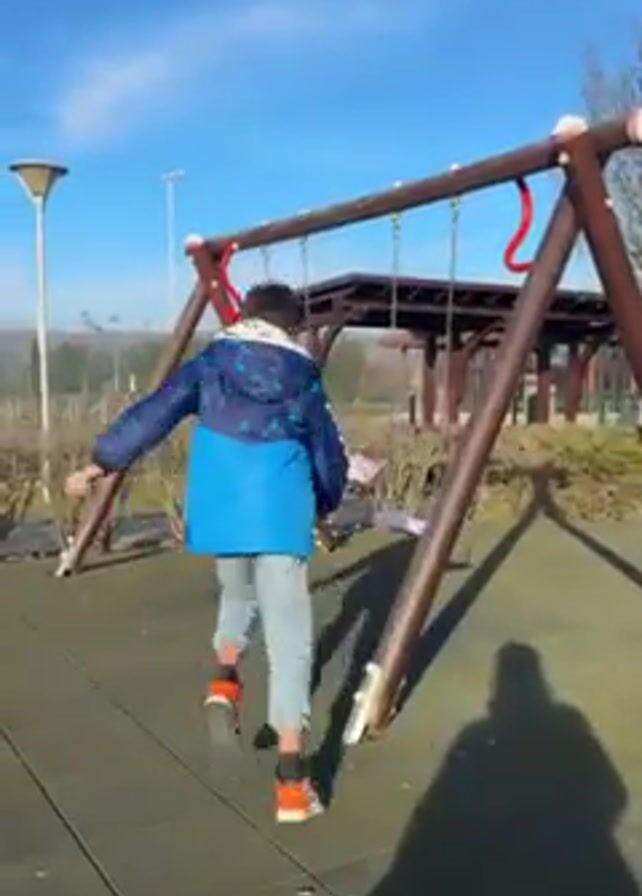 young person getting on a swing set in an outdoor playground