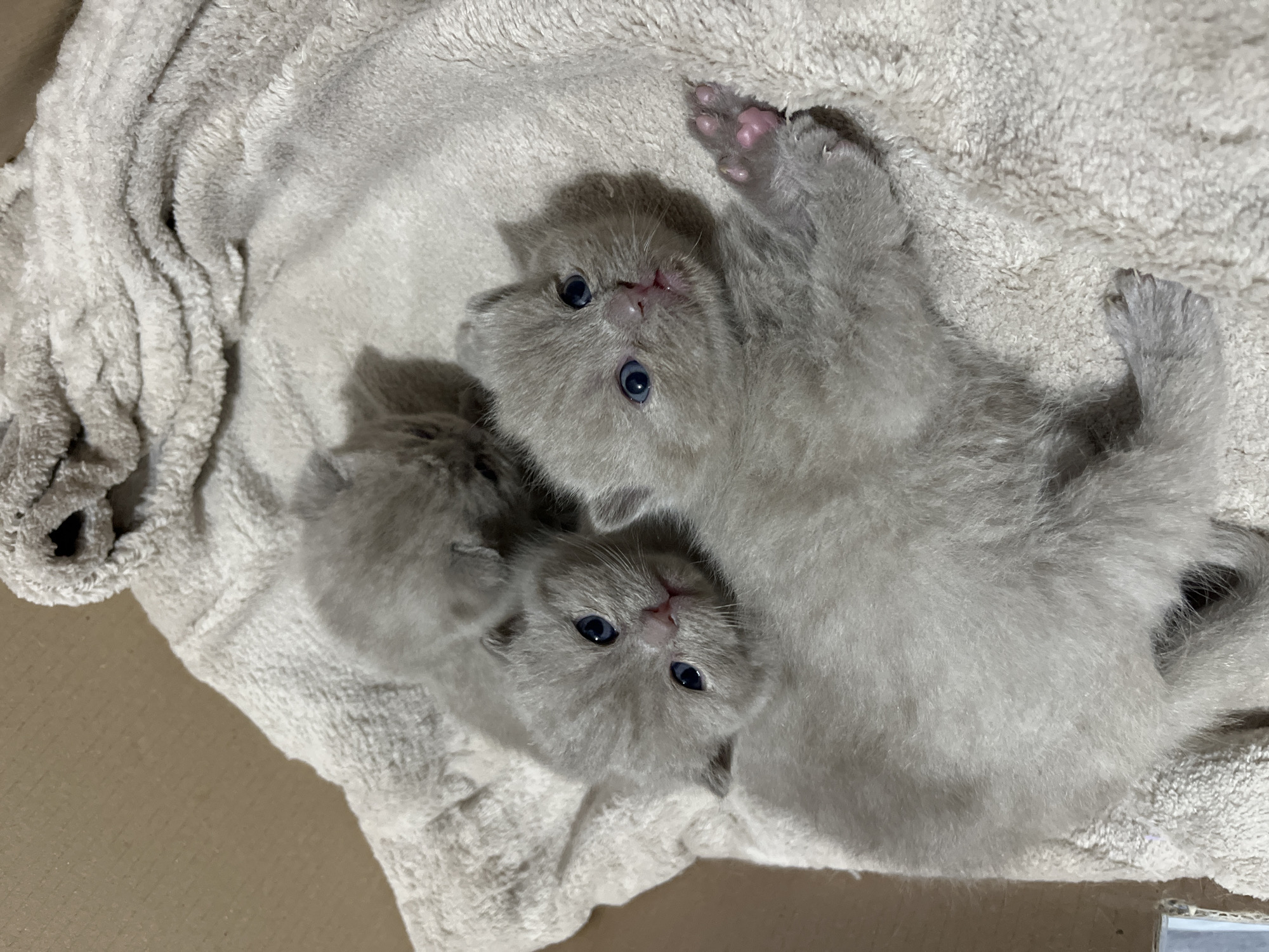 - "three gray kittens lying on a white towel" by FM-JCVbC2, licensed under CC BY 4.0