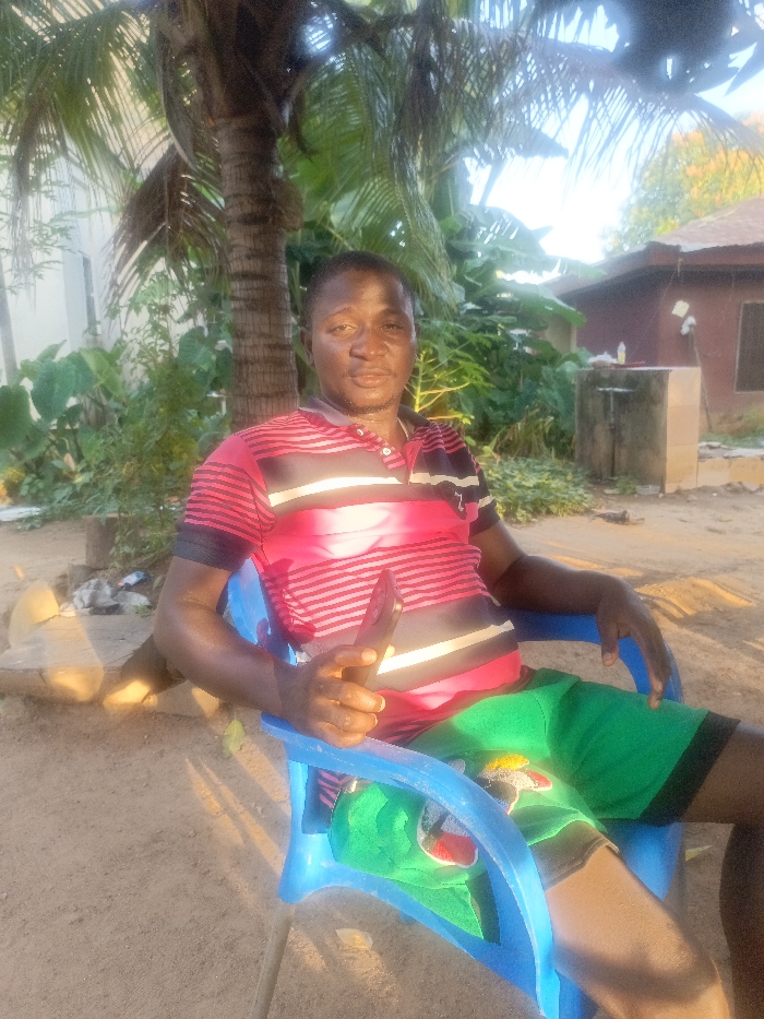 An adult male subject is seated outdoors in Akwanga, Nigeria, on unpaved dirt ground