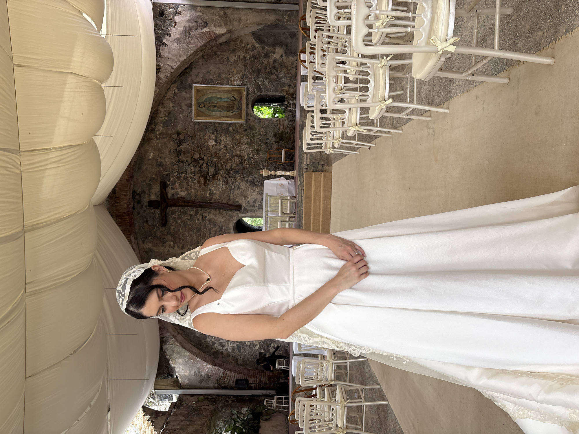 woman in a wedding dress, likely at a wedding venue in Progreso, Mexico. The venue is an old, stone building, possibly a church or chapel, decorated with white chairs and a white canopy. A cross is affixed to one of the stone walls and a painting or icon is hung above a window. The woman is fair-skinned with dark hair and a pearl necklace. She is wearing a lace head covering and holding her dress. The chairs are arranged in rows as if for guests attending a wedding ceremony.