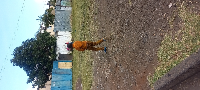 The image depicts an urban residential area in Nairobi, Kenya. In the foreground, a dark, possibly concrete, curb runs along the lower left. The ground consists of uneven dark earth, likely compacted soil or dried mud, interspersed with sparse patches of light green grass. A child, viewed from behind, is the primary subject in the mid-ground. The child wears a patterned brown or orange long-sleeved top and matching patterned trousers. Blue athletic shoes are visible on the child's feet, with the left foot slightly lifted as if in motion or standing casually. Behind this child, a makeshift fence constructed from corrugated metal sheets forms the backdrop. The fence panels vary in color, featuring sections painted blue, white, and unpainted grey/rusted segments. A yellow-painted door is integrated into the white section of the fence, slightly to the left of the image's center. Two or three smaller children are partially visible behind the fence, near the base of the white panels and to the left of the yellow door, appearing to be seated or crouching on the ground. One of these children wears a pink or red top. Behind the fence, multi-story residential buildings with windows are discernible. A large, mature tree with dense green foliage stands prominently behind the fence on the left side, partially obscuring the buildings. The sky above is clear blue, with faint power lines stretching across the upper portion of the frame.