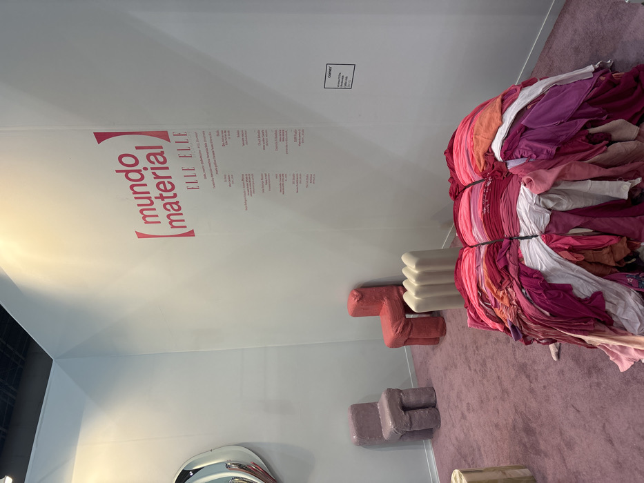 A room features an art installation. A wall displays "mundo material ELLE ELLE" text and smaller text. Pink, red, and white fabric is bundled with straps. Below, are two small chairs, one red and one purple. One cream colored stool sits nearby. The room has lavender colored carpeting and white walls. A small square sign is on the wall near the bundled fabric.
