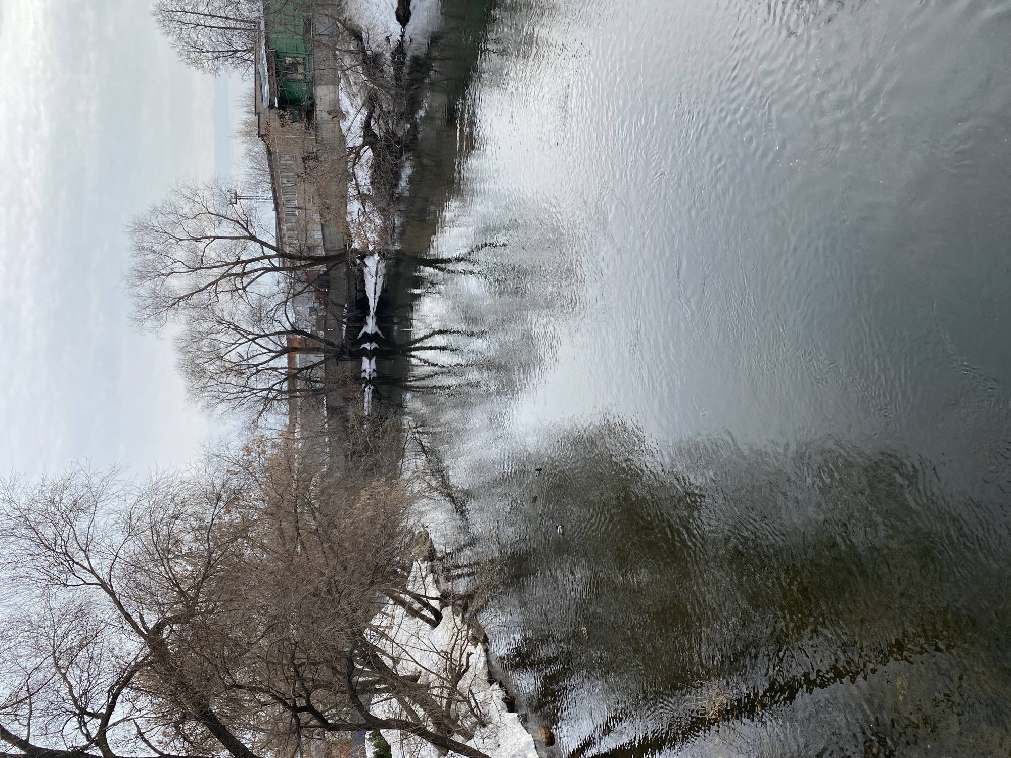 winter scene in Izhevsk, Russia. A river, primarily gray and reflective, fills most of the frame. Along the riverbanks are bare trees without leaves and patches of snow. On the left bank, partially obscured by trees, a building with multiple stories and a light-colored facade is visible. On the right bank of the river, ducks are present. The sky above is overcast and gray. The overall environment suggests a cold, urban winter scene in a Russian city.