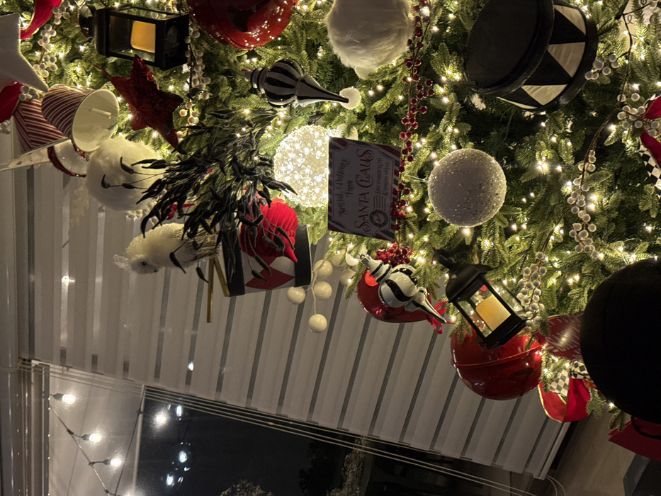 A vibrant Christmas tree, bedecked with an array of ornaments, dominates the scene