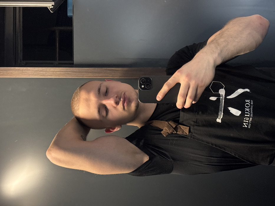 A young adult male is depicted in a mirror selfie taken within an indoor commercial establishment, likely a bar or restaurant, located in Sofia, Bulgaria. The subject, featuring a buzz cut and light skin, is wearing a black short-sleeved t-shirt and a black apron. The apron displays a mirrored white logo, including Japanese characters and the text "ROKU GIN THE JAPANESE CRAFT GIN." He holds a black smartphone with triple camera lenses in his left hand, pointed towards the mirror to capture the reflection. His right arm is bent and raised, with his hand resting on the back of his head/neck, highlighting a developed bicep. His eyes appear closed or are cast downwards. The environment behind the reflection consists of a plain, dark gray wall. A vertical wooden frame is visible on the right, bordering a dark, recessed section of the room. A distinct, elongated light reflection is present on the upper left portion of the mirror. The specific address of the establishment is not identifiable from the provided visual evidence.
