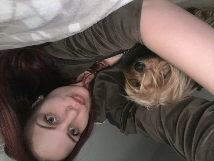 An adult female and a small dog are depicted in an indoor setting, likely in Sofia, Bulgaria. The female, with reddish-brown hair and green eyes, is partially visible, wearing a dark olive-green zippered top, and appears to be taking a selfie. Her left arm is extended towards the camera. A small, long-haired dog, possibly a Yorkshire Terrier, with tan and brown fur, rests its head on her chest, nestled near her left arm. The background includes a light grey wall and white, textured bedding with a subtle pattern. The scene conveys a calm, personal moment.