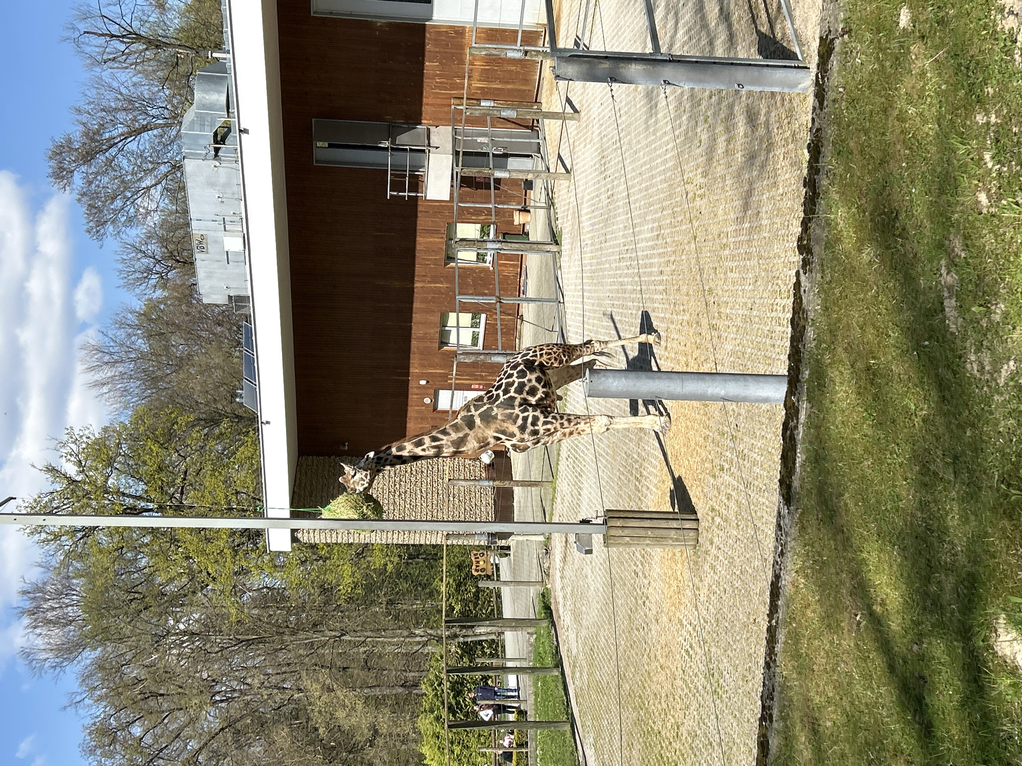 A giraffe eats from a hay feeder mounted on a metal pole at the Krakow Zoo in Poland. The zoo includes a low fence along a grassy area, a building with brown wooden siding, and a paved area. The sky is blue with some clouds and deciduous trees.