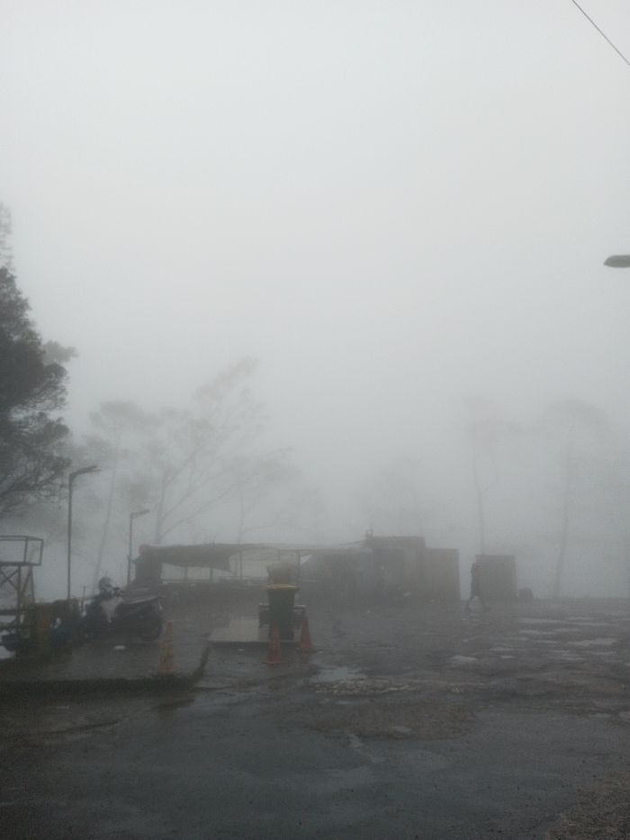 The image depicts a heavily fog-enshrouded outdoor scene in Dawathang_Dorjibi_ Kashingtsawa, Bhutan