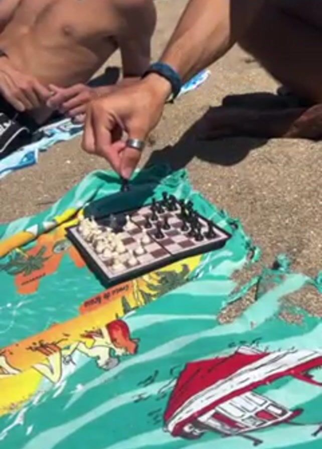 Two shirtless men are playing chess on the beach. A small travel chess set sits atop a colorful beach towel spread out on the sand. One man moves a black pawn on the board while the other watches. In the background, the beach stretches out under a sunny sky.