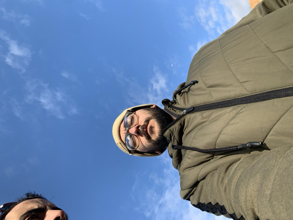 The image captures an outdoor scene in Ouislane, Morocco, from a low-angle perspective, dominated by a clear blue sky with sparse white clouds. A faint white crescent moon is visible in the upper right quadrant of the sky. The primary subject, an adult male, occupies the lower central portion of the frame. He is looking upwards with his eyes closed, wearing a light beige knit beanie, brown-framed eyeglasses, and has a dark, full beard and mustache. He is dressed in an olive green puffer jacket with a dark zipper and black drawstrings, featuring patterned stitching on the torso and a ribbed texture on the sleeves. The upper left corner of the image partially reveals a second individual, showing only the upper forehead, eyebrow, and bridge of the nose, with dark hair and dark sunglasses resting on their head. A blurred, reddish-brown structure is faintly visible along the bottom right edge, indicating a terrestrial background below the subjects. The lighting suggests direct sunlight.