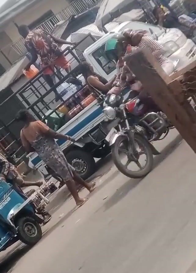 bustling street scene, possibly a market area in a developing country. In the background, a white pickup truck with a blue stripe has several people, including a child, standing on the truck bed amidst various goods. One woman in a black dress walks past the truck on the side. A blue and white three-wheeled vehicle is parked near the truck, and people are seen climbing in and out of it. Several motorcycles are parked on the side, with riders and passengers. The overall environment appears crowded and active, suggesting a busy commercial area.