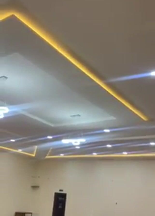 interior of a large, brightly lit room. The room appears to be a banquet hall or conference room, set up with rows of long tables covered in red tablecloths, and chairs. The walls are off-white, and the room features a decorative ceiling with recessed lighting, yellow LED accent lights outlining geometric shapes, and modern, ring-shaped pendant lights. There is a closed door visible on one side of the room. Some indistinct sounds of people talking can be heard in the background.