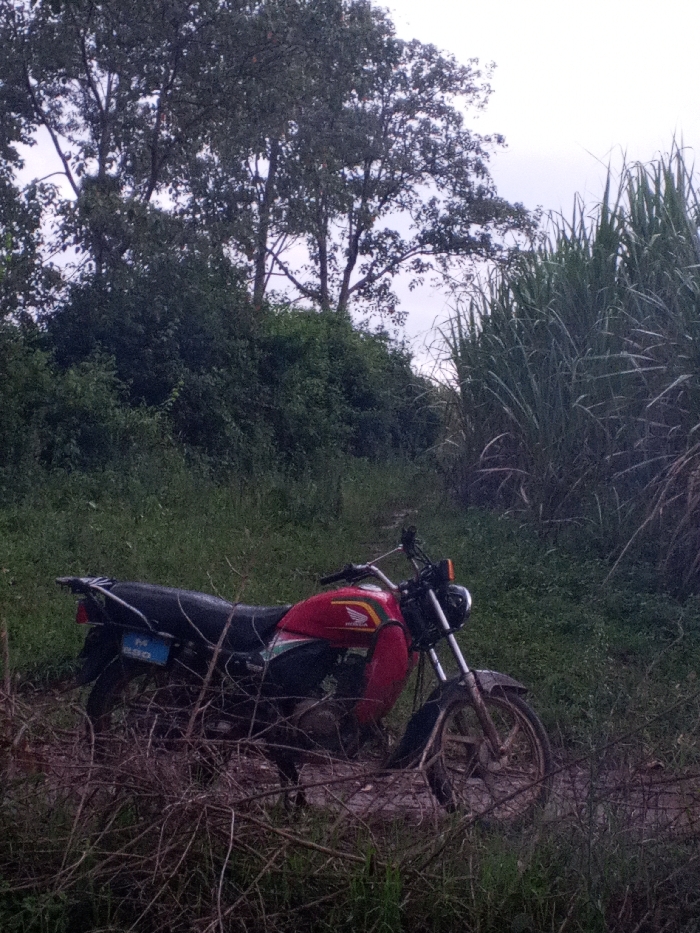 In Keyian ward, Kenya, a red and black Honda motorcycle is stationary on an unpaved dirt path