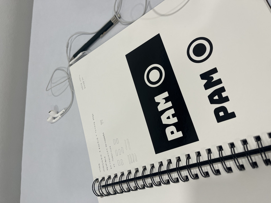 A notepad with spiral binding displays the word "PAM" with a circle containing a dot beside it, repeated twice in bold black lettering. Handwritten notes in what appears to be Spanish are visible on the left side of the page. A pen and white earbuds rest atop the notepad, with the earbud wires tangled beside them. The background appears to be a white surface.