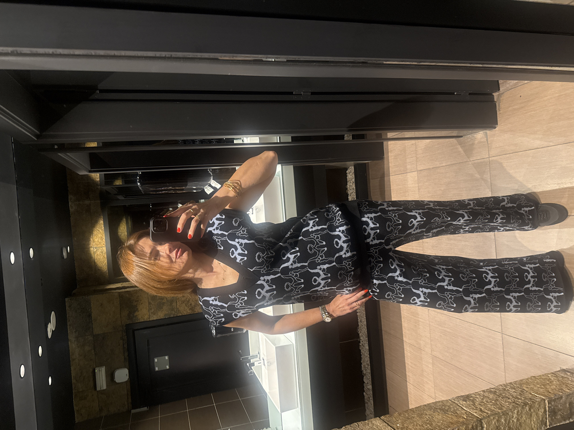 woman taking a selfie in a bathroom. She is wearing a black and white patterned outfit. The bathroom has a modern design with dark fixtures and light-colored tiles. There are multiple sinks and mirrors visible. The floor appears to be tiled with a light wood-grain pattern. A stone-like facade is located on the side. It appears to be a public restroom. The image was taken at the Forum Viseu, in Viseu, Portugal.